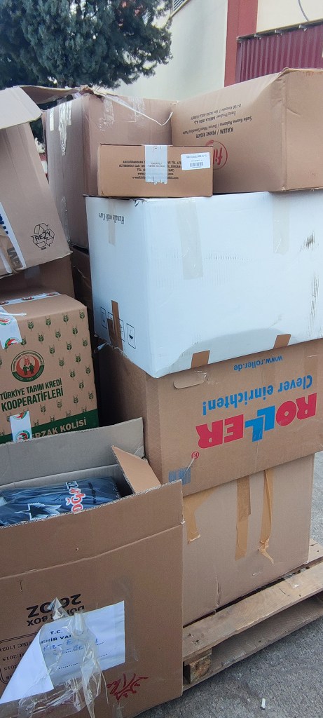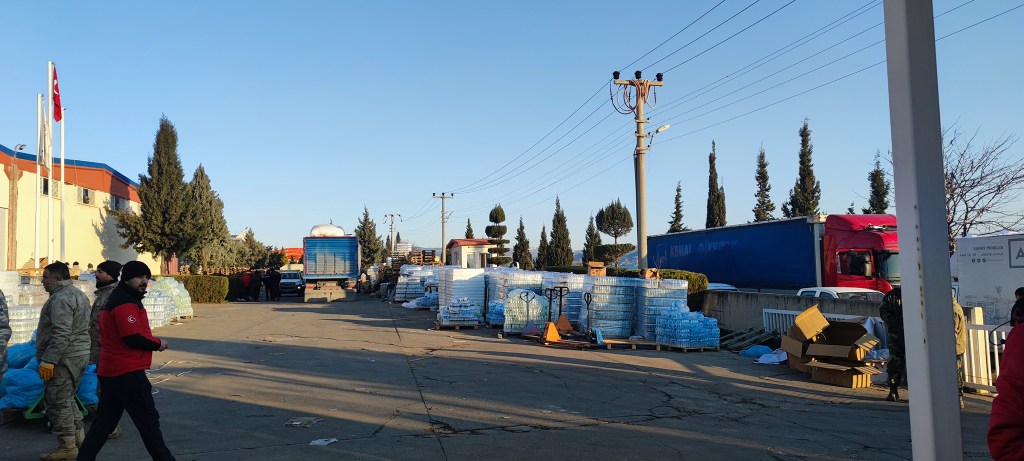 Şehre gelen malzeler çok büyük bir depoda toplanıyor. Bu depoda her tırın ve aracın içeriği kayıt altına alınıp tasnif ediliyor. İkinci el eşyalar ayrılıyor. Bize verildiğinde giymeyeceğimiz hiç bir şey depmremzede kardeşlerimize gitmiyor.